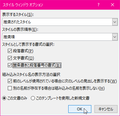 [スタイルウィンドウオプション]ダイアログボックスの[スタイルとして表示する書式]オプションでは「段落書式」「文字書式」「箇条書きと段落番号の書式」の3つを選択しておきます。