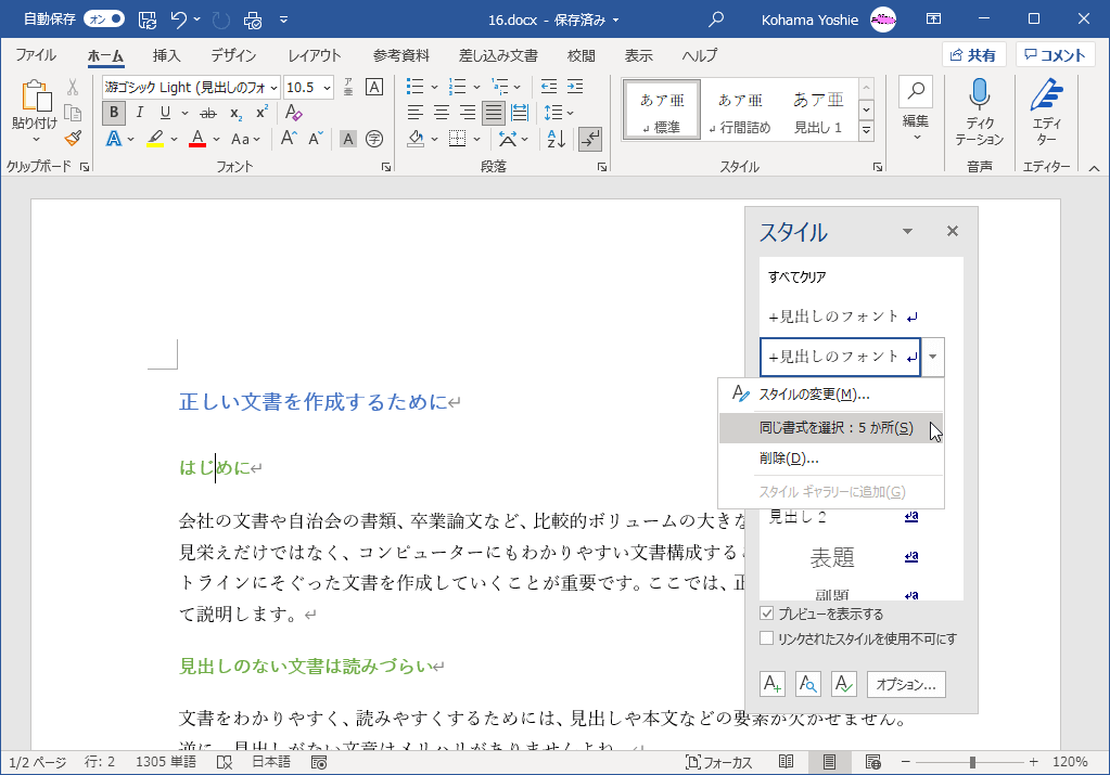 そんなケースに応じて、Word では、同じ書式の文字列をまとめて選択できる機能が備わっています。この機能を利用すれば、それらまとめて「見出し」に変更できるので、効率的に作業が行えます。