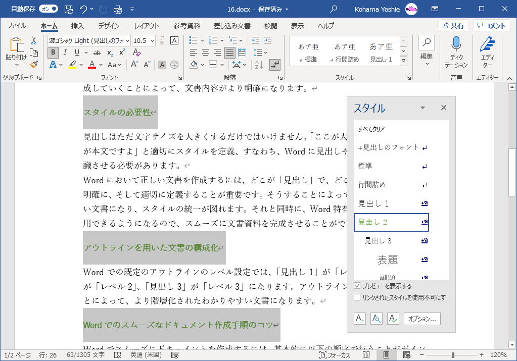 同じ書式の文字列を選択した文字列を「標準」から「見出し」に変更するには、スタイルウィンドウを表示して、対象となる見出しレベルを右クリックして[選択個所と一致するように見出し xを更新する]を選択します。
