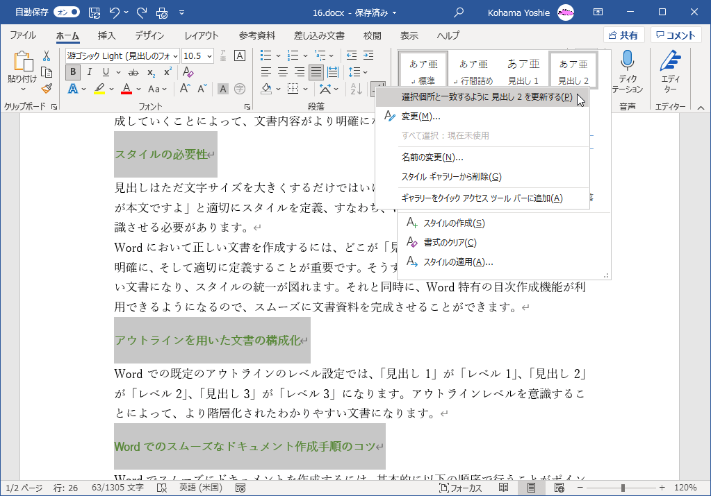 同じ書式の文字列を選択した文字列を「見出し」スタイルに変更するには、スタイルウィンドウまたは[ホーム]タブのスタイルギャラリー一覧から、対象となる見出しレベルを右クリックして[選択個所と一致するように見出し xを更新する]を選択します。