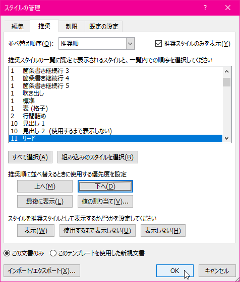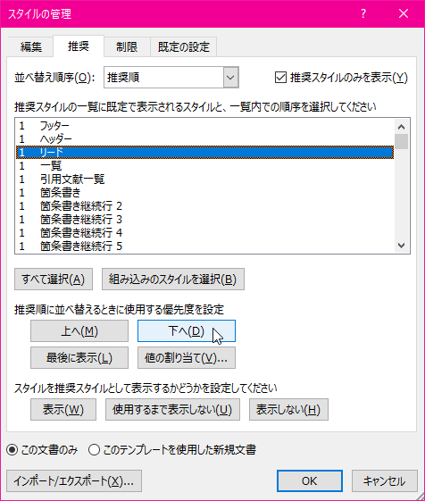 - 順序を変更したいスタイルを選択して[上へ]または[下へ]ボタンをクリックします。