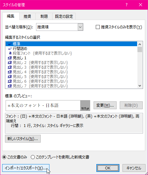 - [スタイルの管理]ダイアログボックスの[インポート/エクスポート]ボタンをクリックします。