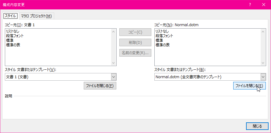 - [構成内容変更]ダイアログボックスの[Normal.dotm (全文書対象のテンプレート)]の右下の[ファイルを閉じる]ボタンをクリックします。