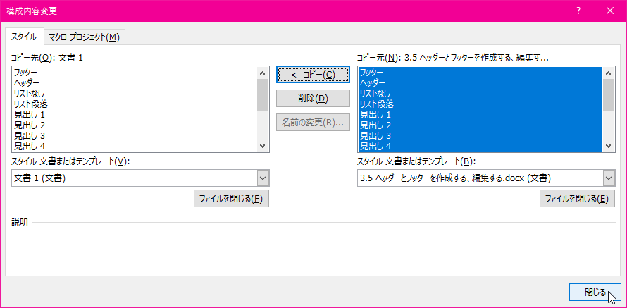 - 指定した文書のすべてのスタイルを選択して、[コピー]をクリックします。