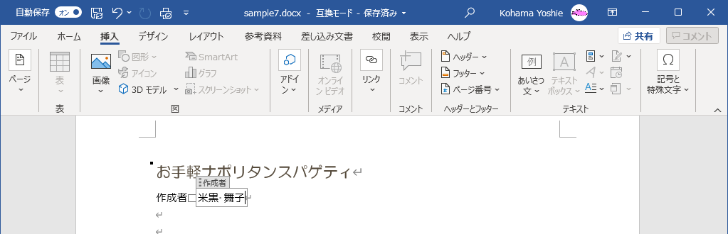 ここでは、前の記事『文書プロパティを挿入するには』の続きとして、作成者の後に作成日と最終更新日のフィールドコードを挿入する方法について説明します。