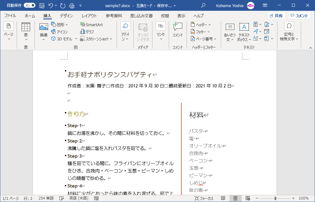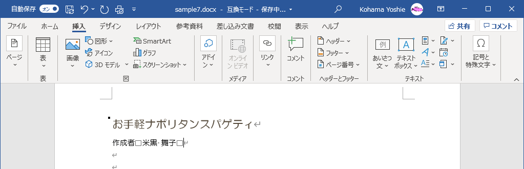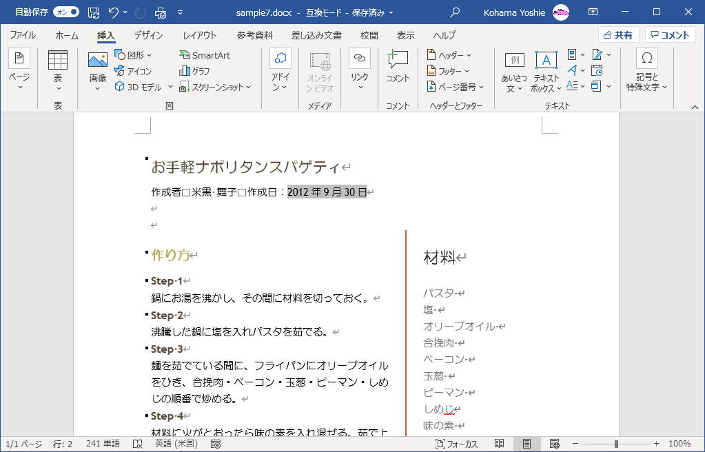 - 「作成日:」と入力し、[挿入]タブを開きます。