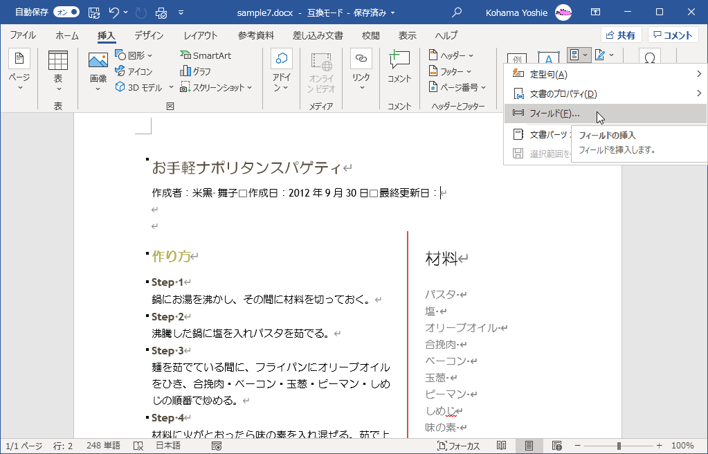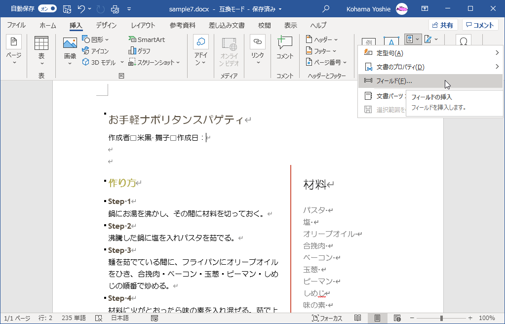 - [テキスト]グループの[クイックパーツ]をクリックし、一覧から[フィールド]をクリックします。