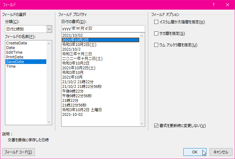 - [フィールド]ダイアログボックスの[日付と時刻]分類一覧より[SaveDate]を選択します。