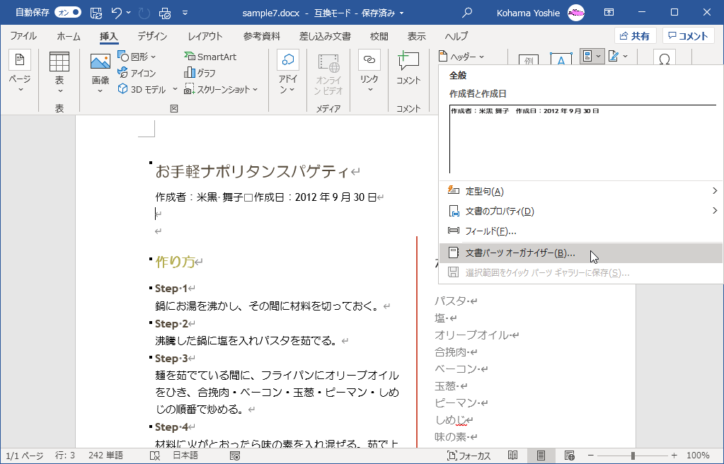 - [テキスト]グループの[クイックパーツ]をクリックします。