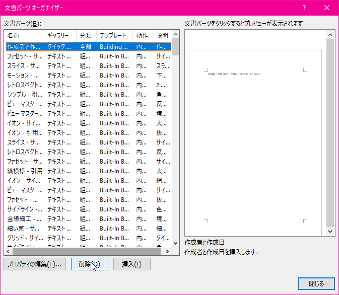 - ギャラリー一覧から目的の文書パーツを右クリックしてショートカットメニューより[整理と削除]を選択します。