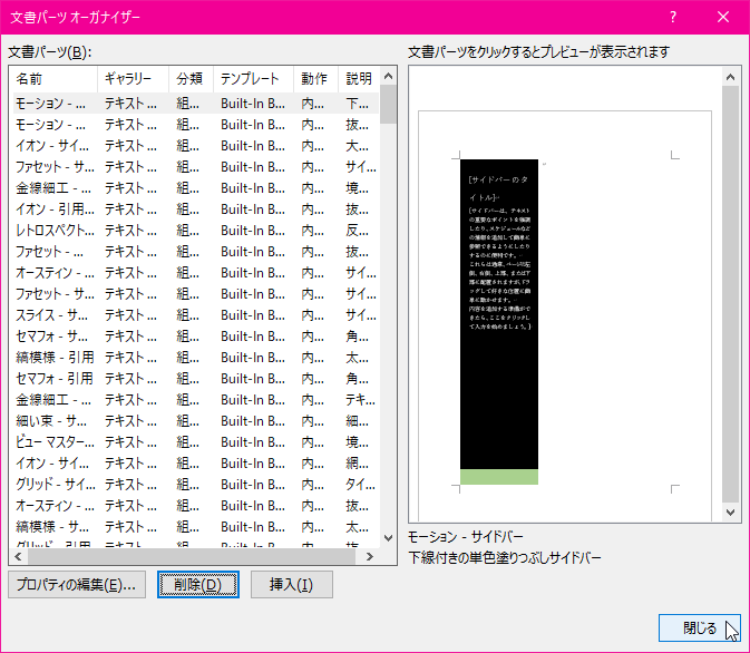 - 文書パーツが削除されたら[閉じる]ボタンをクリックします。