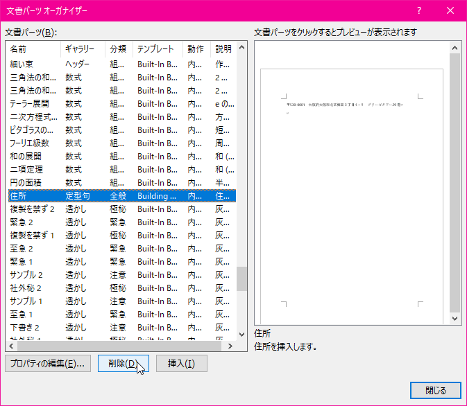 文書パーツオーガナイザーが開き、選択した定型句の文書パーツが選択されるので、[削除]ボタンをクリックします。