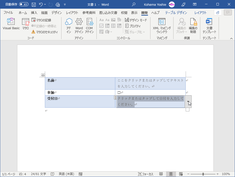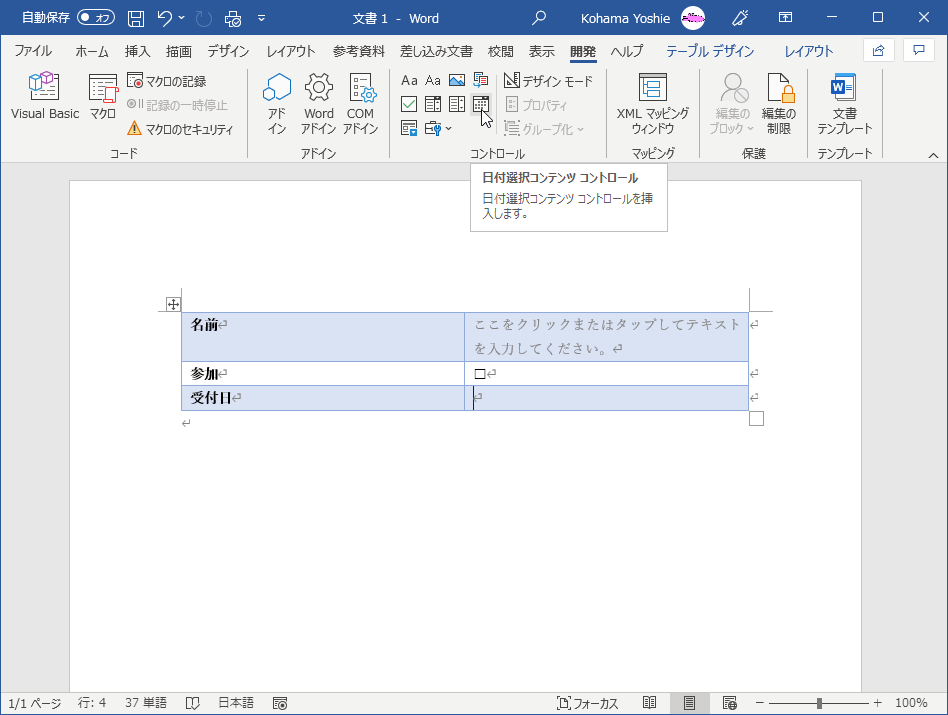 - [開発]タブを開き、[コントロール]グループの[日付選択コンテンツコントロール]をクリックします。
