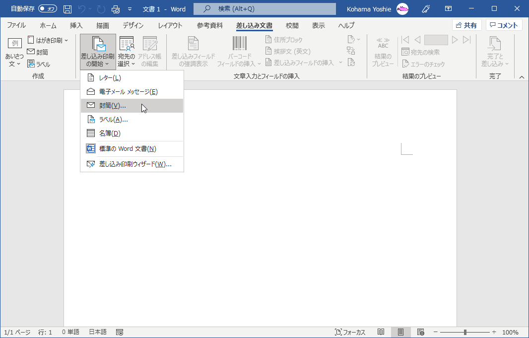 あいにく、Wordの差し込み印刷ウィザードから[封筒]を選択した場合は、どうしても洋式レイアウト(横向きで横書き)になります。日本式の封筒で縦書きの宛名にしたい場合は、手動でそれぞれ設定していく必要があります。