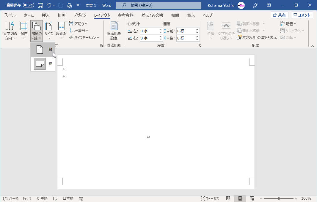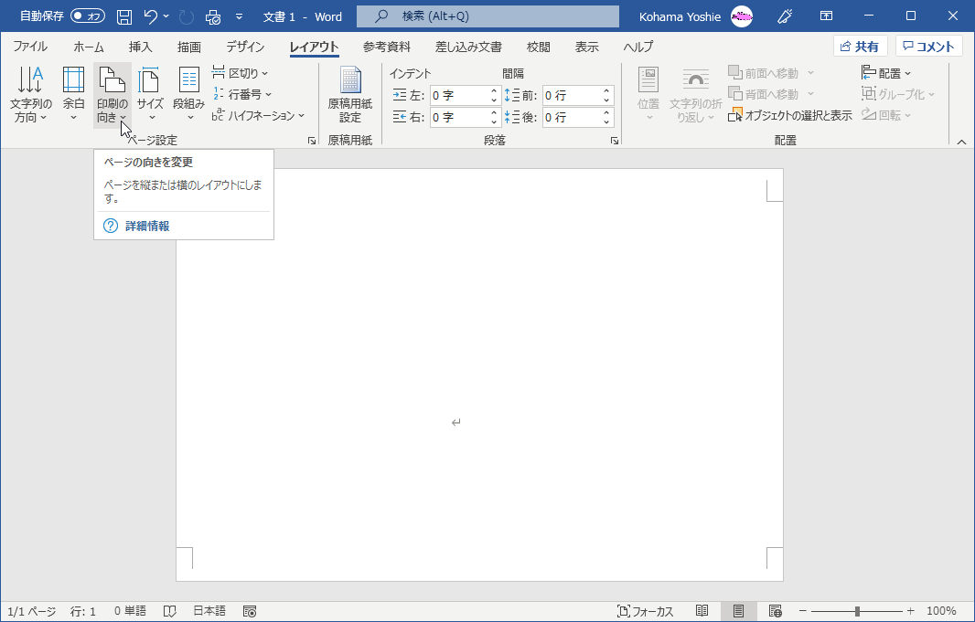 - [レイアウト]タブを開き、[ページ設定]グループの[印刷の向き]をクリックします。
