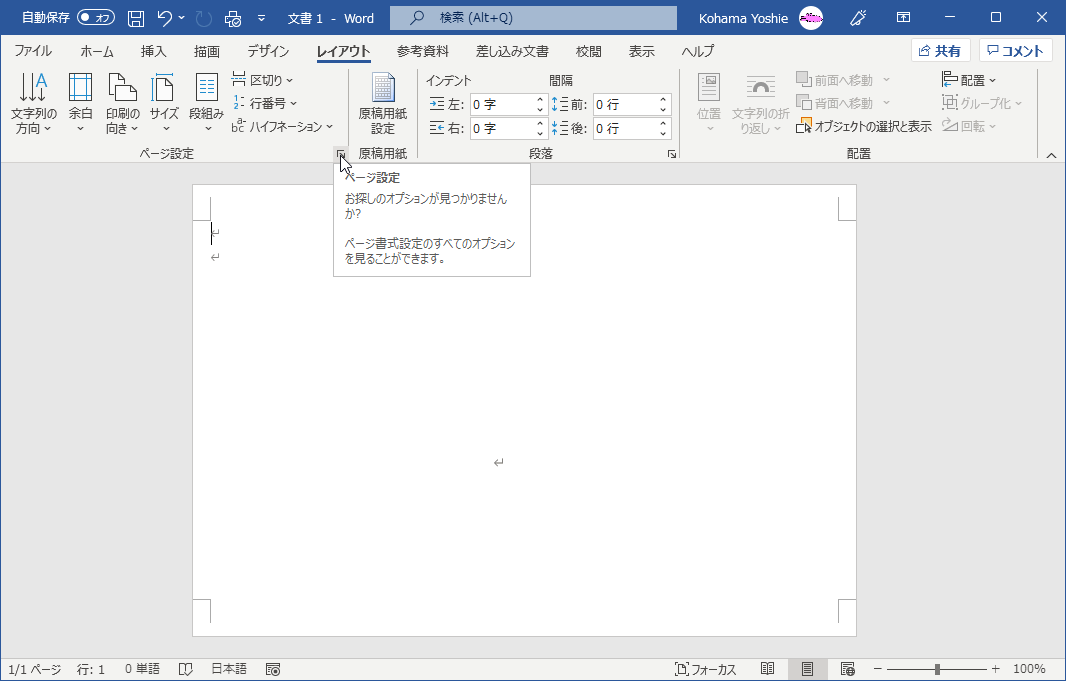 - [レイアウト]タブの[ページ設定]右下のダイアログボックス起動ツールをクリックします。