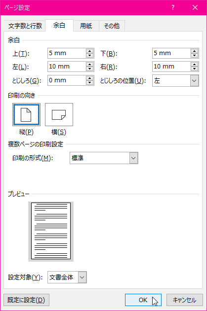 - [ページ設定]ダイアログボックスの[余白]タブを開き、[印刷の向き]を[縦]にして[OK]ボタンをクリックします。