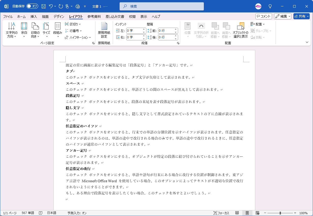 文書全体または現在のセクションの余白を設定するには、[レイアウト]タブの[余白]から組み込みの余白パターンを選択します。
