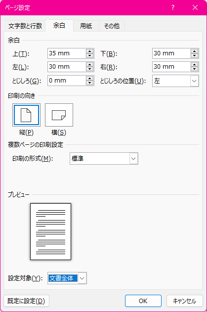 - [余白]グループの上下左右等にそれぞれ余白を設定して[OK]ボタンをクリックします。