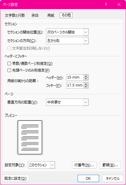 - [ページ設定]ダイアログボックスの[その他]タブを開きます。