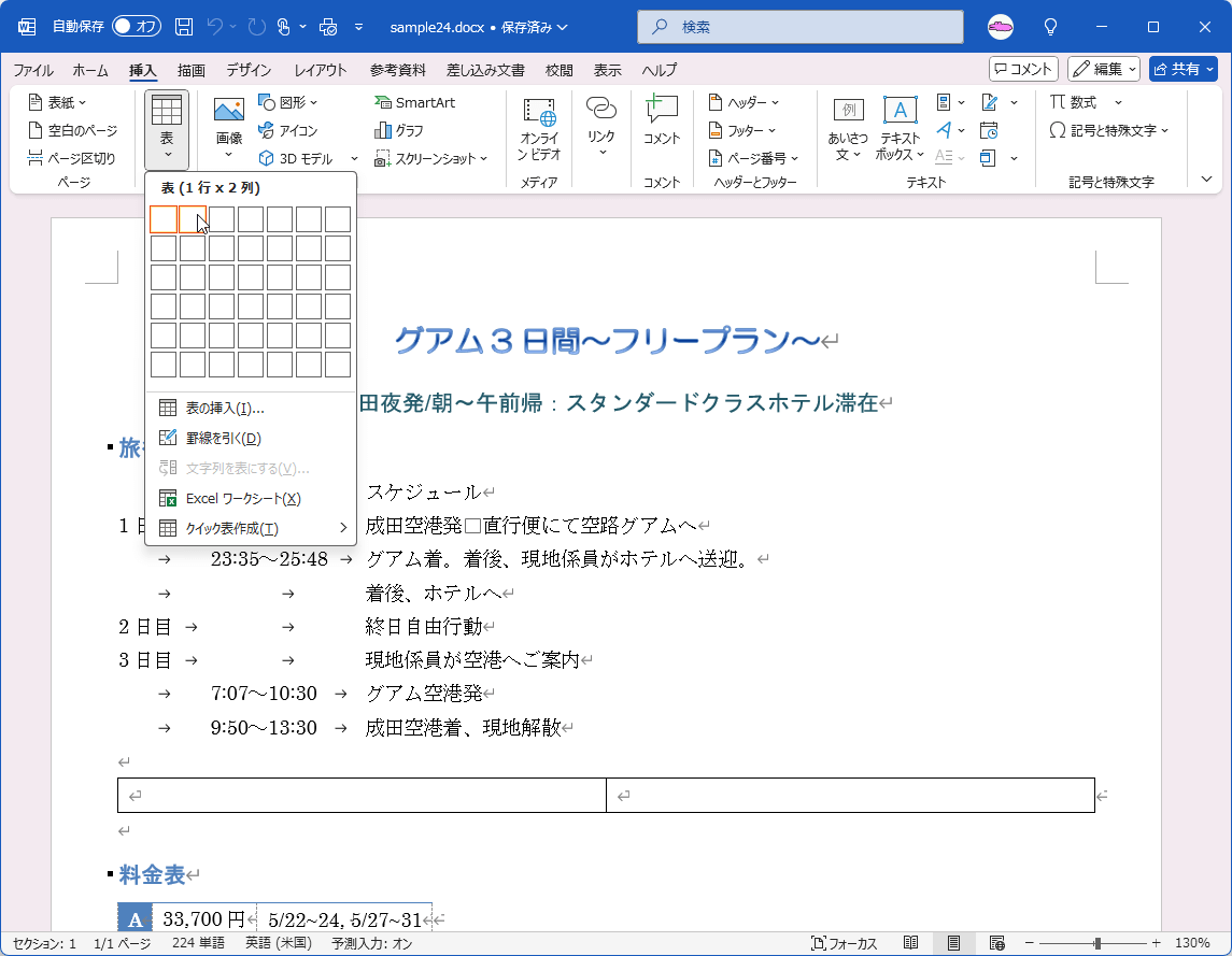 - 挿入したい表にカーソルを移動して[挿入]タブを開き、[表]をクリックします。