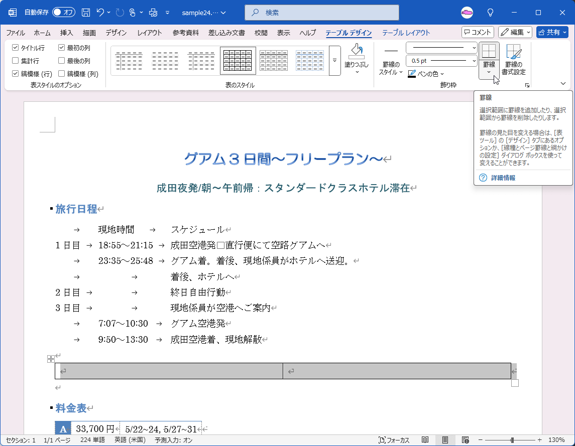 - [テーブル デザイン]タブを開き、[罫線]の▼をクリックします。