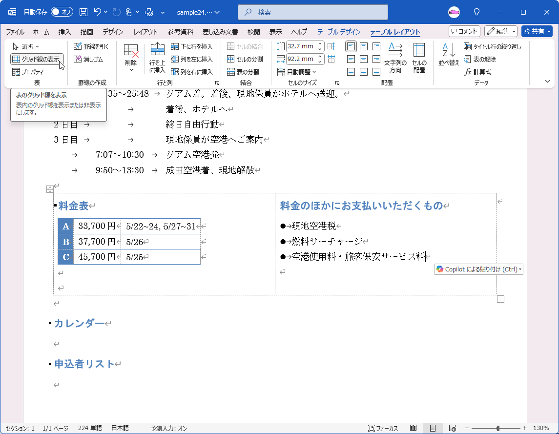 既定ではグリッド線が表示されていますが、たとえば表をレイアウト枠として活用する際に、実際にどのように印刷されるか確認するために罫線なしのレイアウト枠のグリッド線を非表示するには、表内にカーソルを移動して[テーブル レイアウト]タブを開き、[グリッド線の表示]をクリックします。