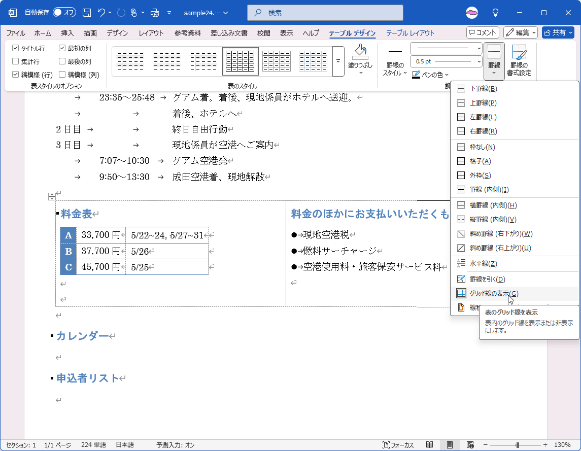 [テーブルデザイン]タブの[罫線]一覧にも[グリッド線の表示]コマンドがあります。