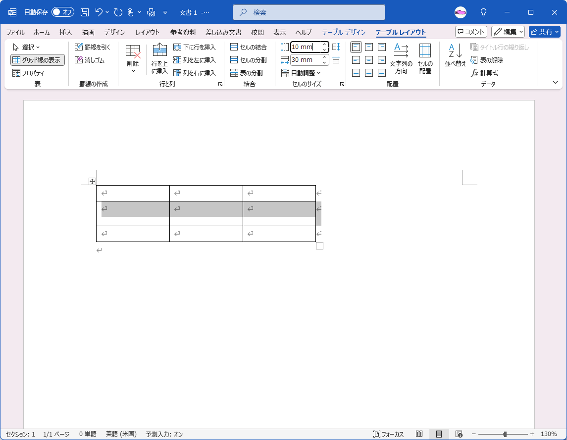 - 対象となる表の行を選択して右側の表の[テーブル レイアウト]タブを開きます。