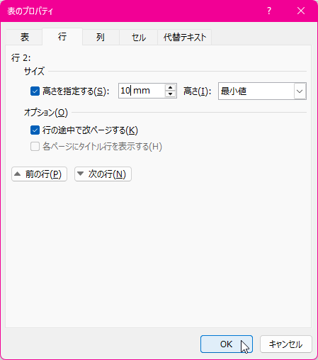 - [表のプロパティ]ダイアログボックスの[行]タブを開きます。