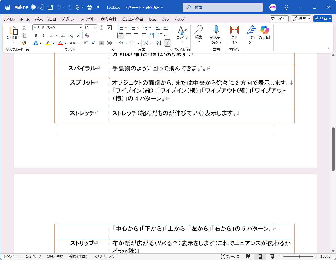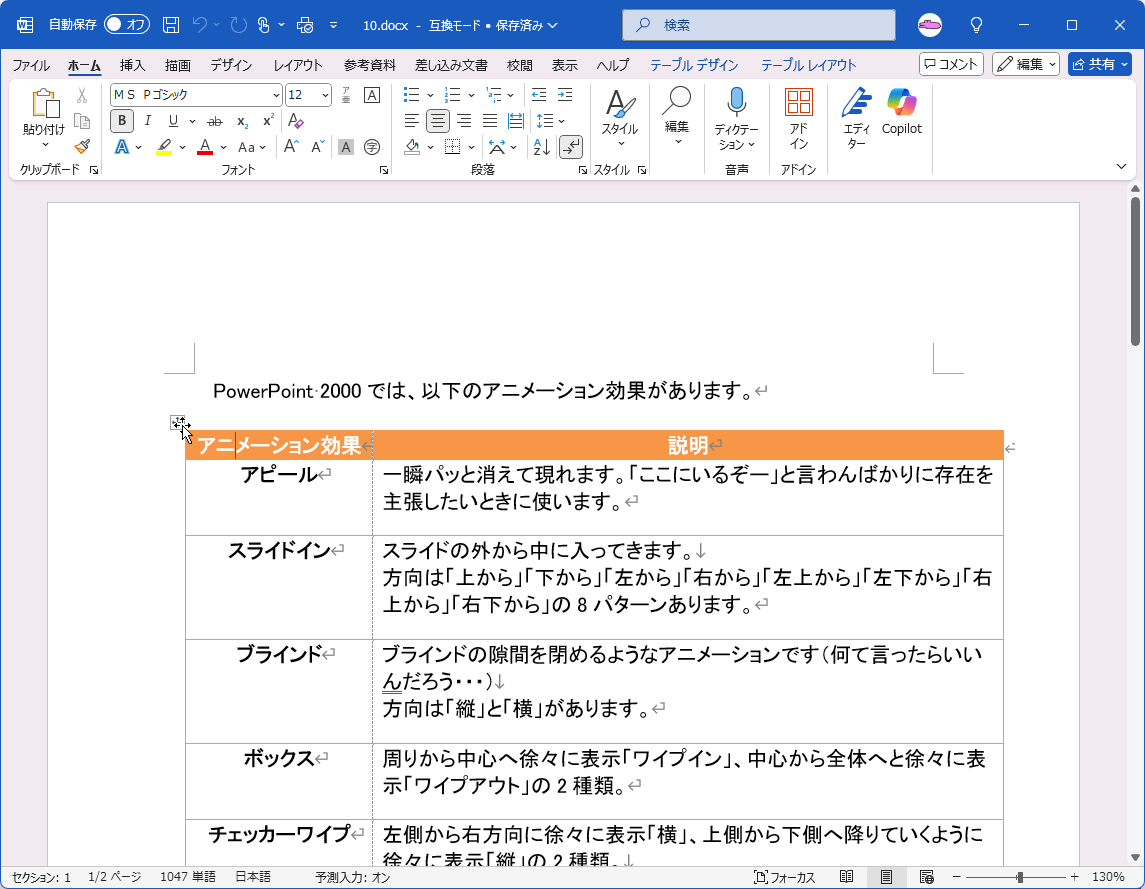 既定では、行の途中で改ページするように設定されています。Word 2010で作成したサンプルファイルでは、ドキュメントの変換を行わない限り、下の図のようにページがまたがる形になります。