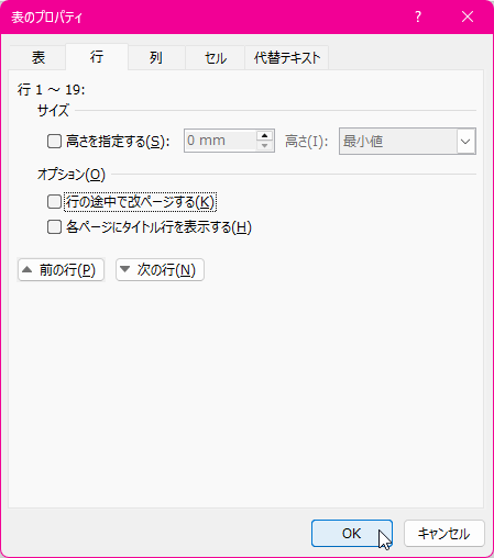- [表のプロパティ]ダイアログボックスの[行]タブを開き、[行の途中で改ページする]のチェックをはずして[OK]ボタンをクリックします。