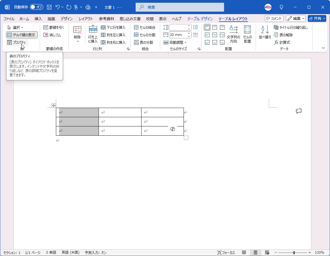 - 対象となる表の列を選択し、[テーブル レイアウト]タブを開いて[表のプロパティ]を選択します。