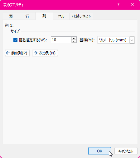 - [表のプロパティ]ダイアログボックスの[列]タブを開きます。