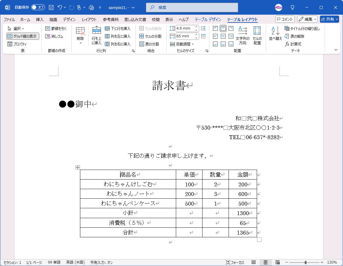 をクリックして表全体を選択します。 - [ホーム]タブの[段落]グループの[中央揃え]ボタンをクリックするか、ショートカットキーCtrl+Eキーを押します。