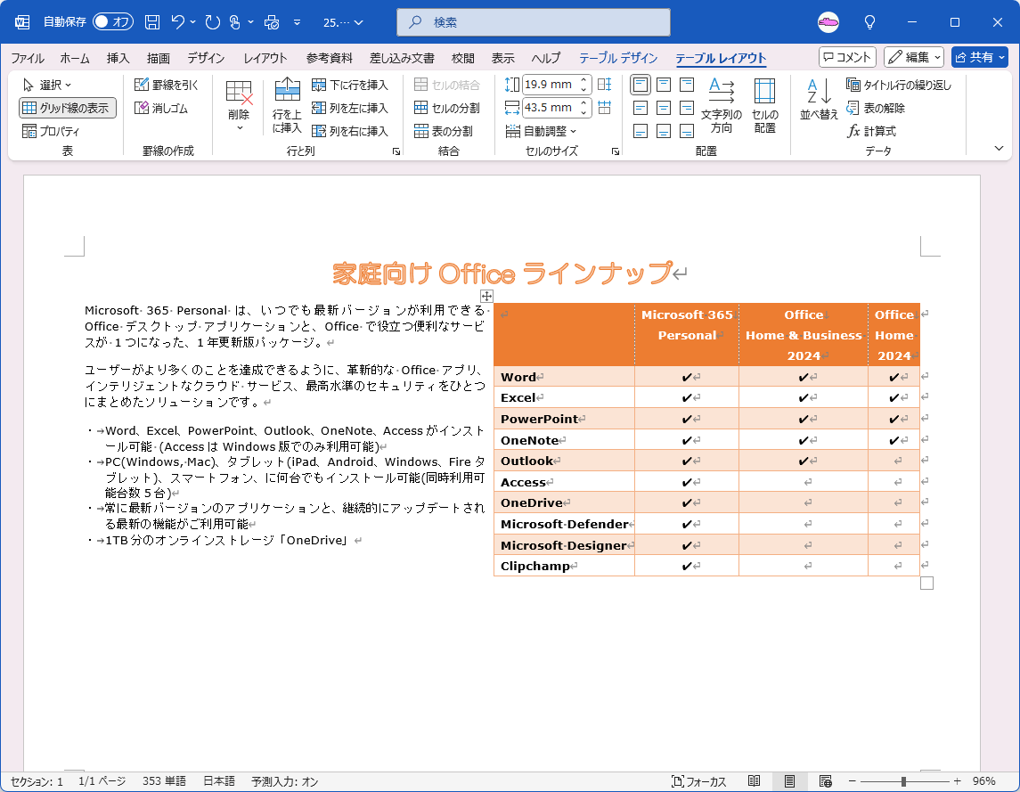 - 表を選択します。表内にカーソルを移動してもOKです。