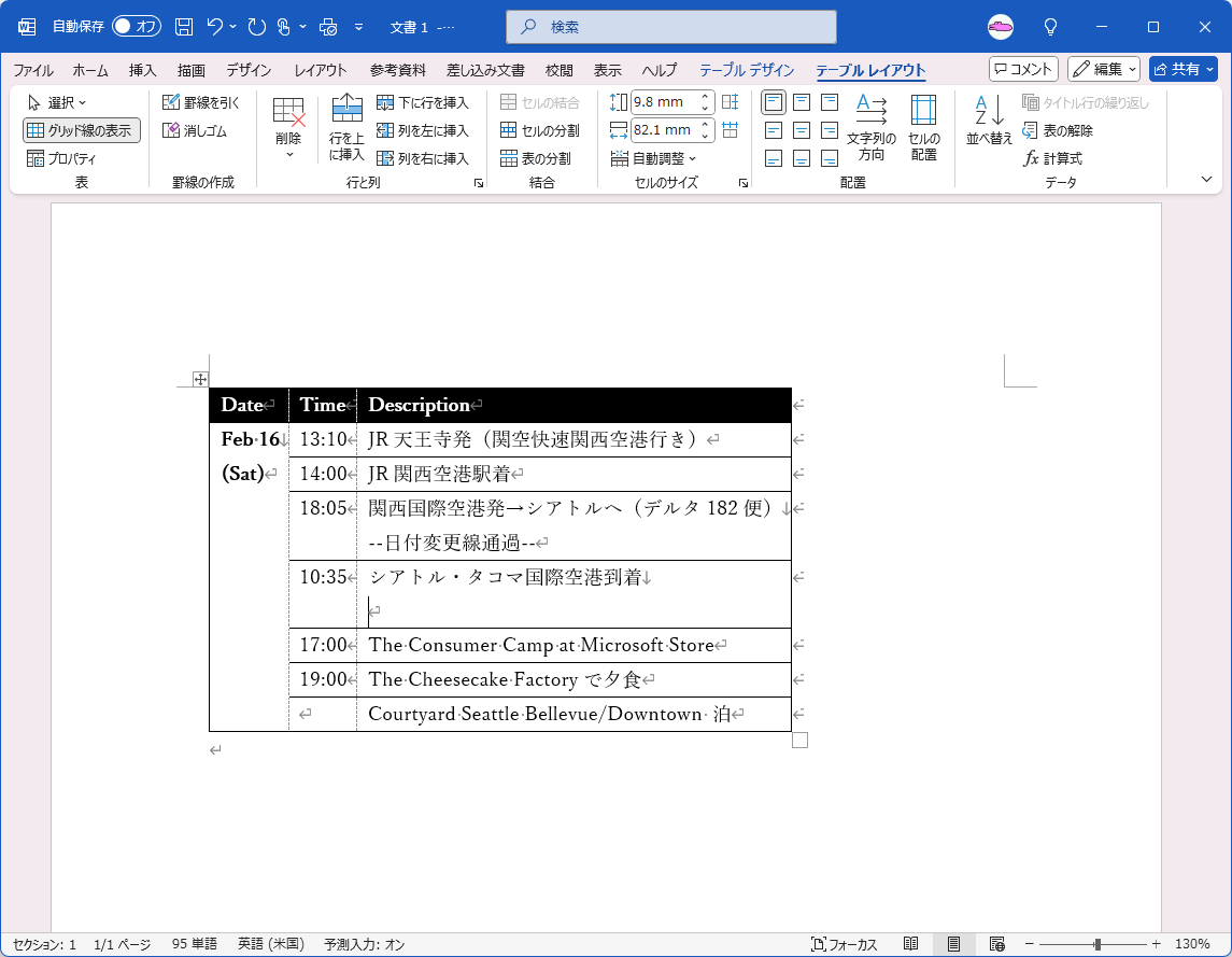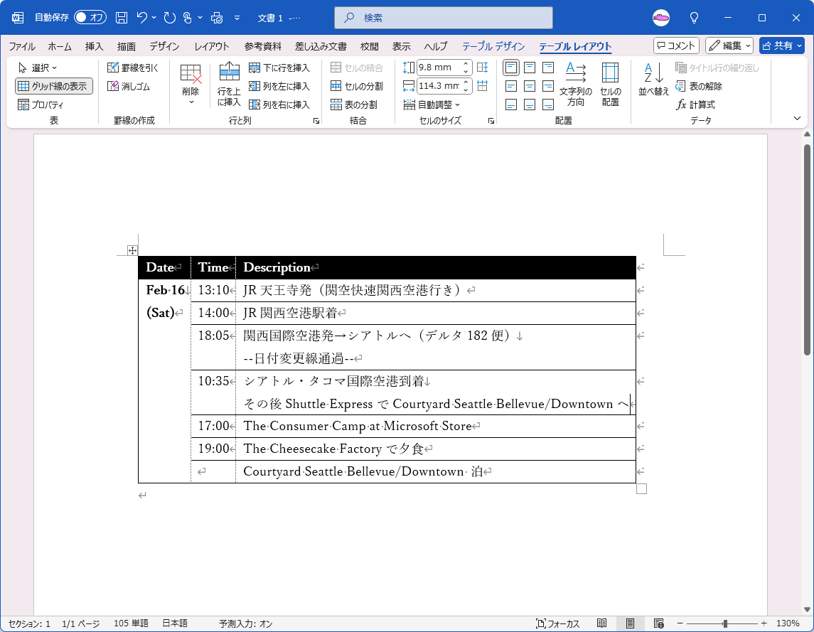 - [表のプロパティ]ダイアログボックスを[OK]ボタンで閉じます。