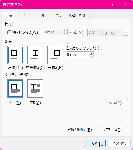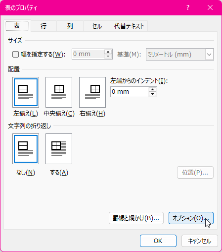 - [表のプロパティ]ダイアログボックスの[表]タブ内の[オプション]ボタンをクリックします。