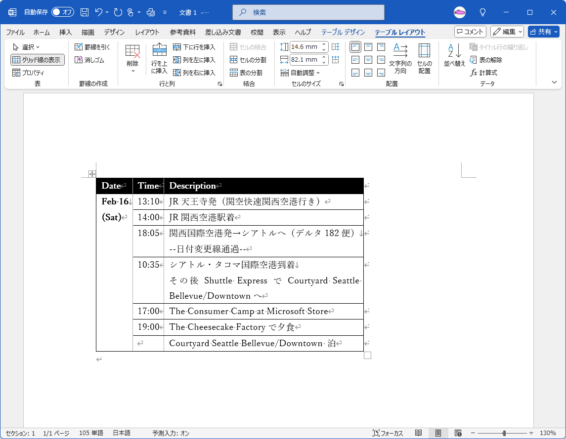 表の列幅は、表全体の幅が指定されていない場合、入力する文字列や図に合わせて自動的に変わります。列幅よりも長い単語を入力すると、その文字列が収まるように列幅が調整されます。