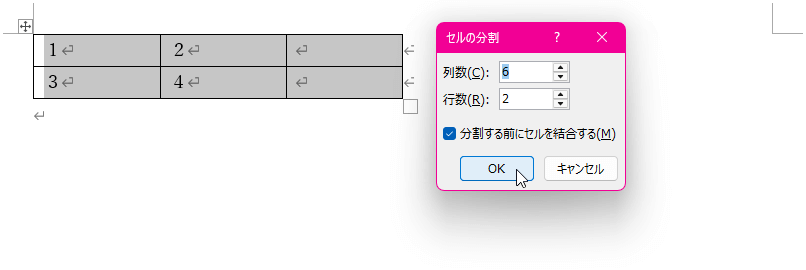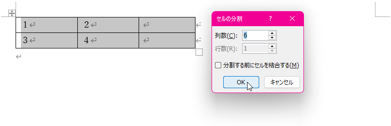 例えば、2行3列の1行目のそれぞれに「1」「2」、2行目のそれぞれに「3」「4」と入力した状態で、「分割する前にセルを結合する」を有効の状態で6列2行にした場合、左から順番に並べ替えられます。