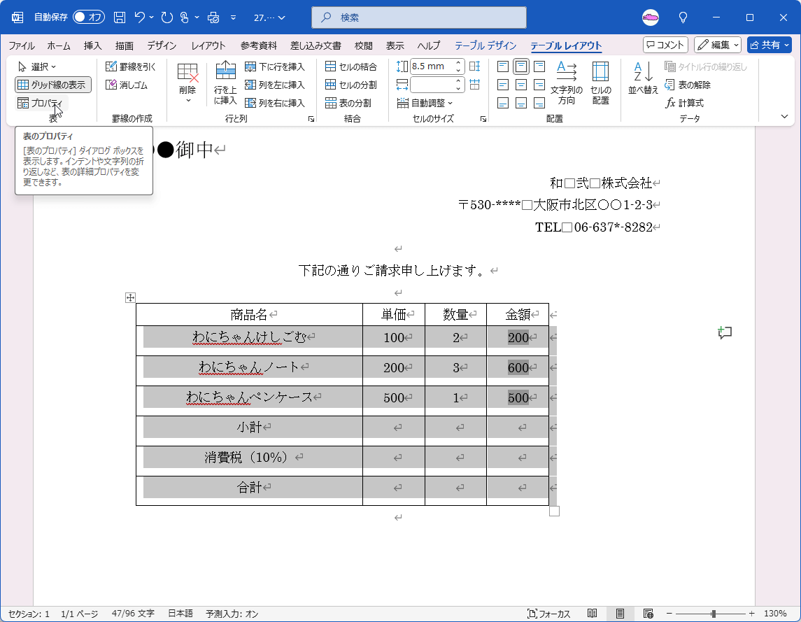 表のプロパティから文字列の配置方法を変更する