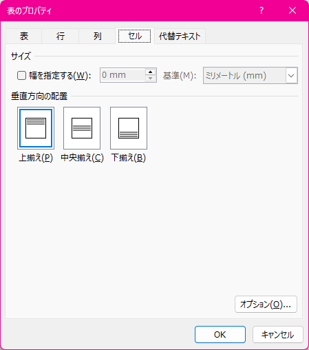 表のプロパティの[セル]で操作できるのは、垂直方向の配置のみです。