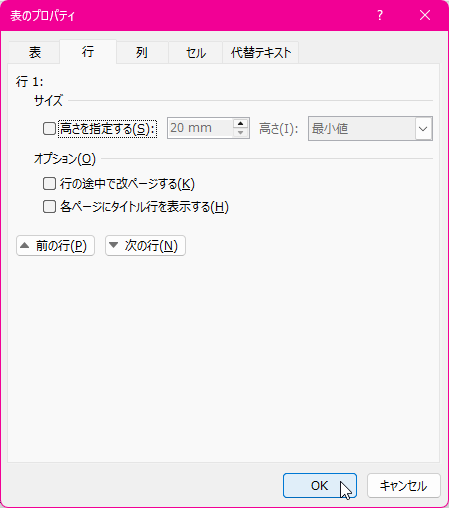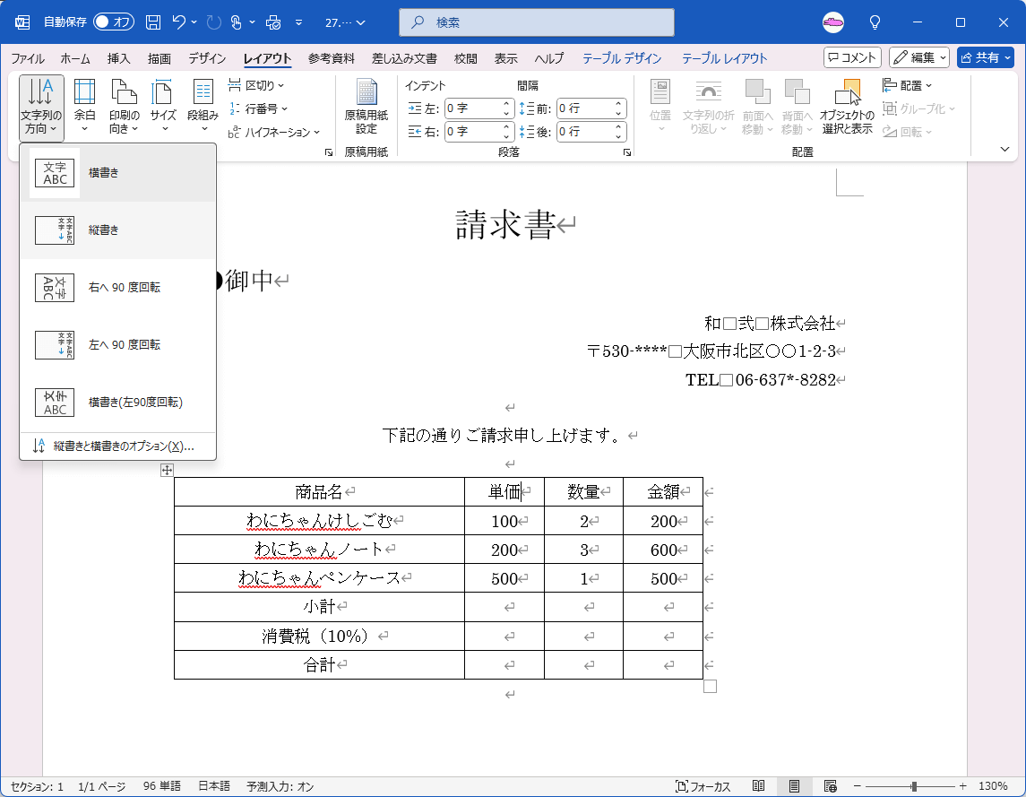 文字方向を変更したあと、行の高さが固定されてしまい、[テーブル レイアウト]タブの[セルのサイズ]グループの行の高さの変更ができなくなります。