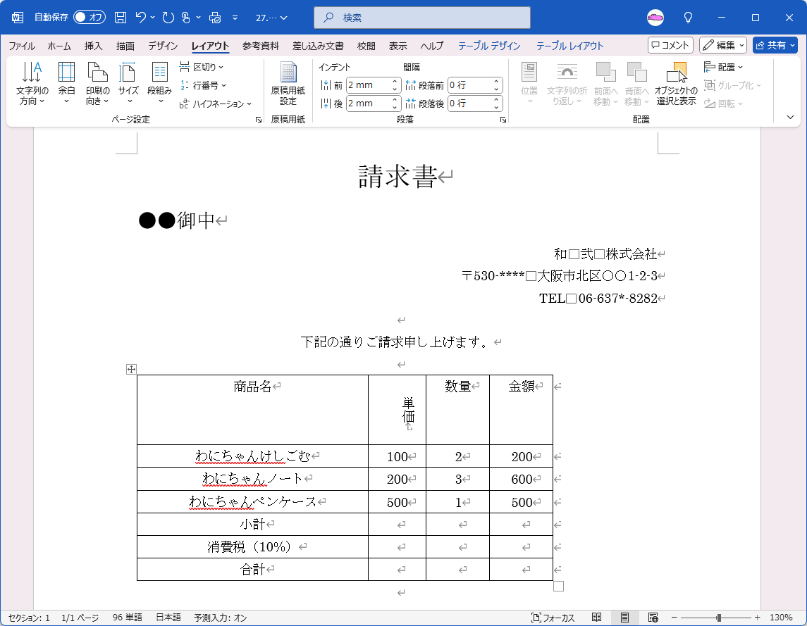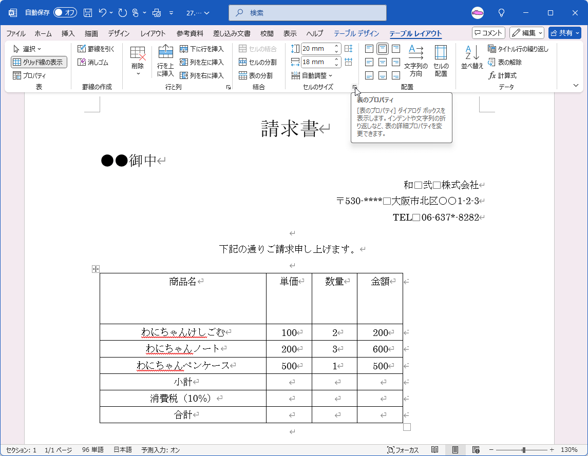 - 対象となるセルを選択し、[テーブル レイアウト]タブを開きます。