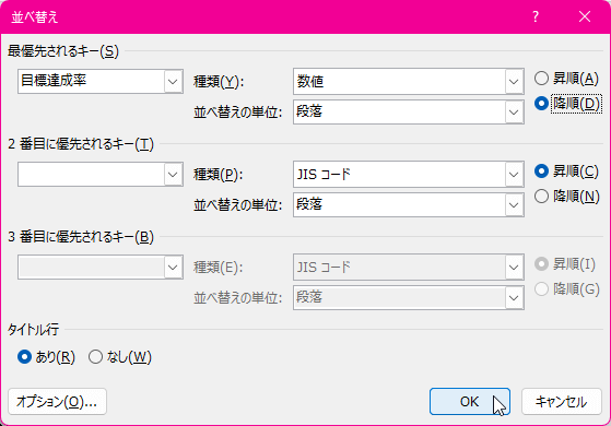 - [並べ替え]ダイアログボックスが表示されたら、[タイトル行]には[あり]が選択されていることを確認します。