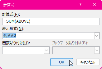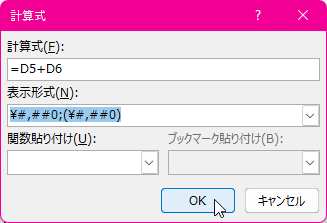 - [計算式]ダイアログボックスの[表示形式]ボックス一覧から「#,##0」を選択して、[OK]ボタンをクリックします。