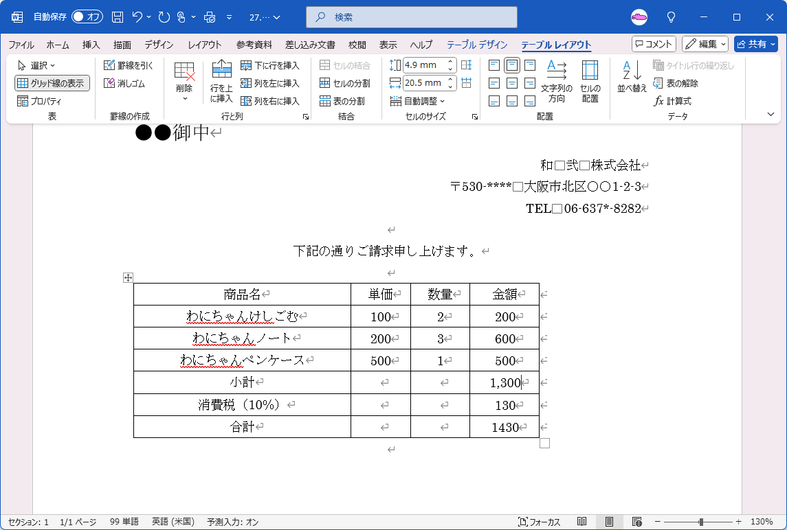 - 小計セルにカーソルを移動して、[テーブル レイアウト]タブを開き、[データ]グループの[計算式]をクリックします。