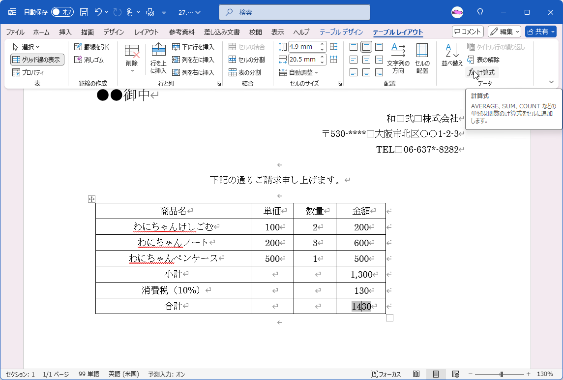 - 合計セルにカーソルを移動して、[テーブル レイアウト]タブを開き、[データ]グループの[計算式]をクリックします。