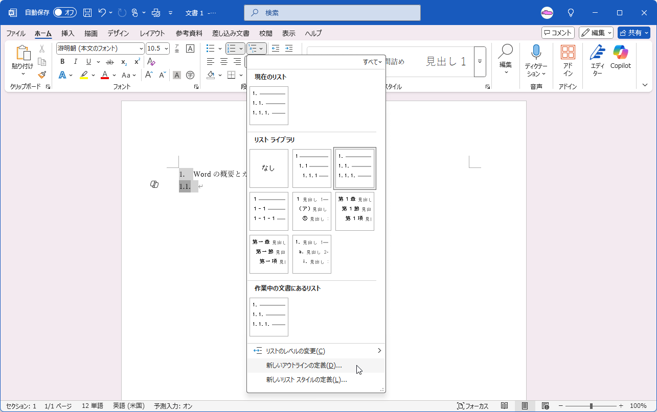 - [アウトライン]ボタンの▼をクリックし、[新しいアウトラインの定義]をクリックします。