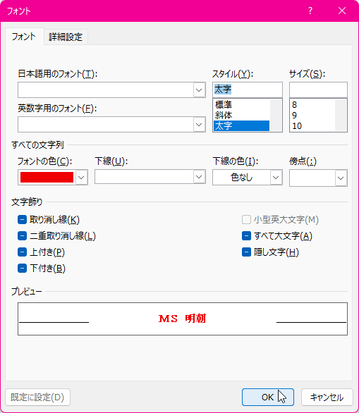 [フォント]ダイアログボックスで、番号部分のフォントスタイルを指定します。ここでは赤の太字に設定して、[OK]ボタンをクリックします。